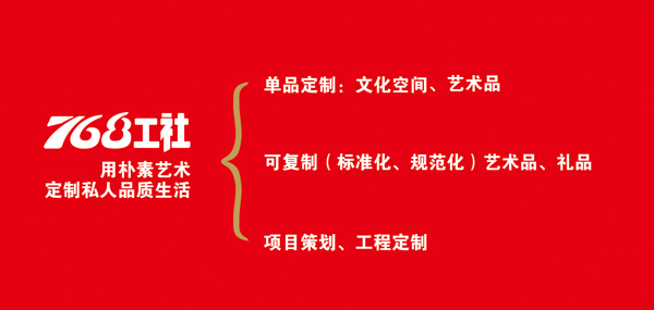 朴素的文化艺术品牌,品牌艺术的高级别创作、创造和制造者,首创朴素文化的重要观点,是朴素文化的倡导者、朴素文化的领导者、朴素文化的手工艺者,在尊重传统文化、地方与民间文化的基础上,用艺术手法创造性地开发与传承,让文化去创造艺术,用艺术去发展文化。768工社集工作室、劳动者、手工艺于大成,享文化、艺术、品牌于一身的个性化空间,是传统文化、地方艺术的传承、开发与创作平台;是物与物、人与人、人与物,文化与艺术的交流平台;是将文化、艺术与品牌的综合展示平台;是以文化为灵魂,以艺术为形态的高级别制造平台;更是文化、艺术销售的交易平台。768工社的目标是打造河北省的文化地标。